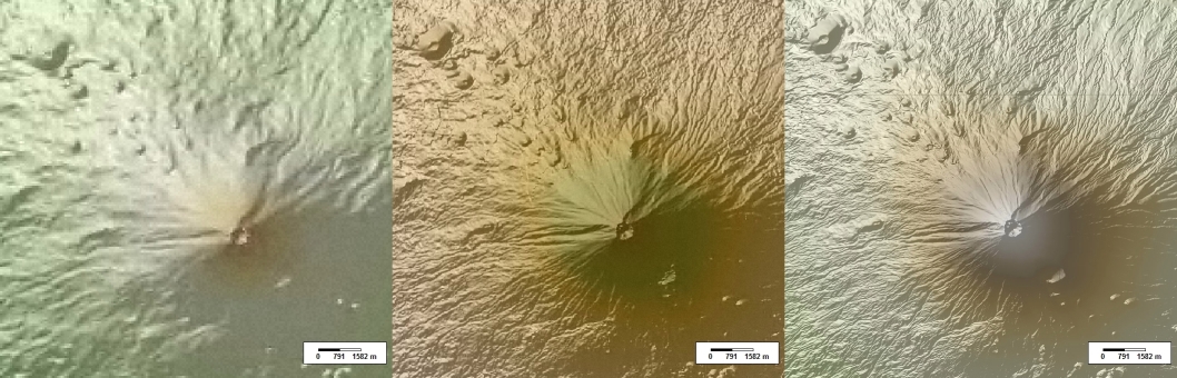 彩色陰影起伏図変換結果 上:ジオイド画像、上右:50mメッシュ画像、中央:10mメッシュ画像、下:90mメッシュ画像