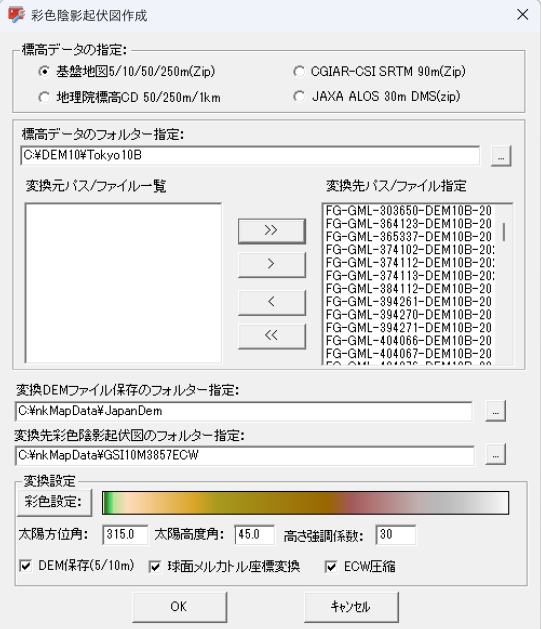 nkMapViewのメニュー「ツール」の「彩色陰影起伏図作成」を選択し、標高データフォルターは元データフォルターを指定し、一覧から変換が必要のファイルを選択し、右側の変換先のファイルへ移動します。彩色陰影起伏図の変換先フォルターを指定し、「OK」ボタンを押すと選択されたファイルにより彩色陰影起伏図を作成します。
