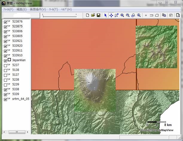 変換済みのファイルについては、位置及び投影情報は付くので、個々ファイルでマップ作成、レイヤー追加は行えます。また、nkMapViewは「定義済みレイヤー」として直接閲覧できます。閲覧方法は下記「5.変換画像の表示/連続表示:」を示します。