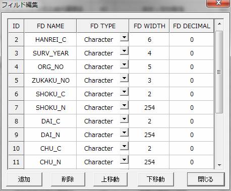 また、「編集」-「フィルド編集」により、フィルドの名前変更、新規追加、既存削除、相対位置移動も可能になります。フィルド編集のフィルド名ではDBFファイル仕様で最大半角10文字/全角5文字までの制限があります。フィルド値の文字列の場合「Character」、数値列の場合では「Number」に選択します。フィルド値の幅数は「FD WIDTH」で設定、「FD DECIMAL」数値の精度になり、倍精度小数点以下の桁数を表示します。整数場合では「FD WIDTH」幅値に11、「FD DECIMAL」精度値0とします。倍精度場合では「FD WIDTH」幅値に19、「FD DECIMAL」精度値11とします。文字列の場合、「FD WIDTH」の桁数は最大255まで、「FD DECIMAL」は無効です。