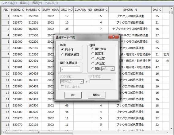 「増分加算」の操作は、まず追加列/範囲の1番目に初期値を入力し、追加列/範囲を選択後に「増分値/固定値」に増分値を入力し、「OK」ボタンをクリックします。