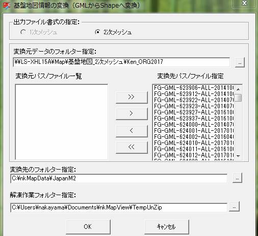 nkMapViewのメニュー「ツール」の「基盤地図情報Shape作成」を選択し、変換元データのフォルターを指定し、一覧から変換が必要のファイルを選択し、「OK」ボタンを押すとShapeファイルを変換できます。なお、県別にzipファイルが複数フォルターに保存し、全国一括変換する場合、県界の重複地域のファイル変換しないように設定されます。また、変換済みファイル一覧を「meshucode.txt」へ記録します。