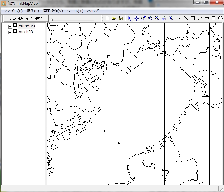 個別ファイル表示場合、nkMapViewのメニュー「編集」−「新規レイヤー追加」/「新規テキストレイヤー追加」で表示可能です。2次メッシュで連続表示する場合、メニュー「編集」−「新規標準メッシュレイヤー追加」/「新規標準メッシュテキストレイヤー追加」で表示します。