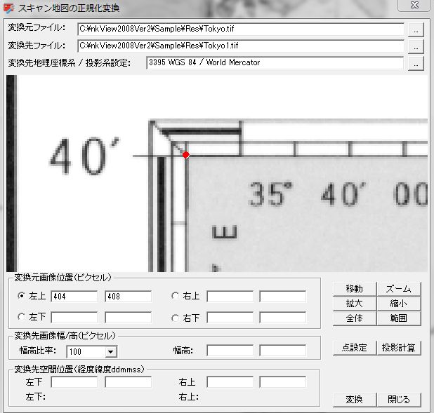 2.左隅のピクセル位置を確定します。「変換元画像位置」の「左上」を選択します。図面を「移動」、「ズーム」、「拡大」、「縮小」、「全体」、「範囲」の操作で地図の左隅位置を表示し、「点設定」をクリックし、画面の左隅位置を選択します。