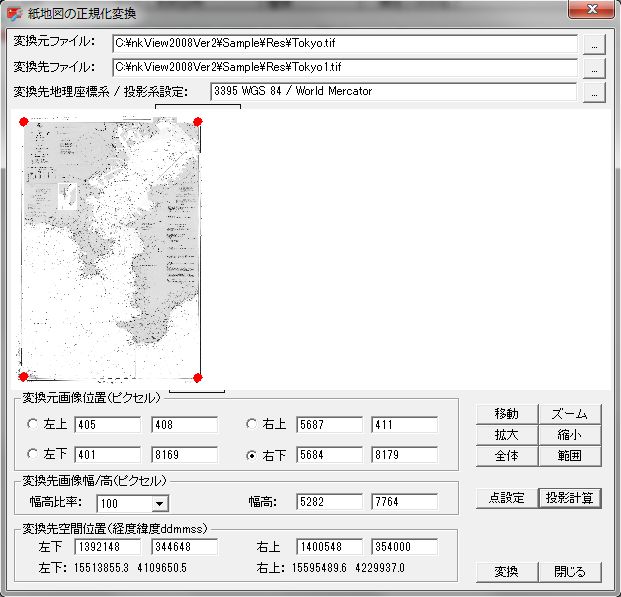 地図変換前に詳細の地図四隅位置及び地図投影系の確定が必要です。4点線形補間により正規化変換します。変換地図は四隅内範囲を保留し、四隅以外は切り落されます。