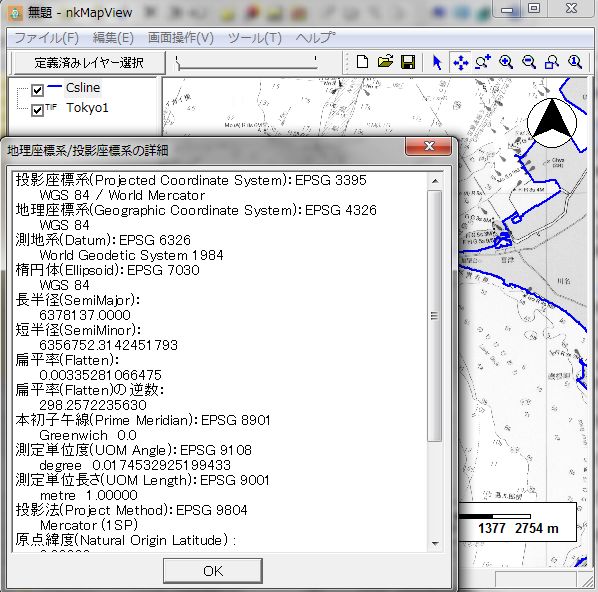 8.変換済み図面を本ソフトで確認します。まず「C:\nkMapData\Cstline.shp」緯度経度からメルカトルを投影変換し、Csline.shpで保存します。そして新規マップファイル作成します。「ファイル」ー「マップ新規作成」のフォームで変換済みTIFフィル選択します。画面表示後に「編集」ー「新規レイヤー追加」で「C:\nkMapData\Csline.sh」選択し、図面を海岸線データの重複をチェックします。