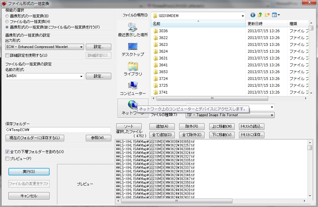 TIF無圧縮画像ファイルから圧縮ECWファイルに一括変換します。ランセンス制限のため、変換元各ファイルサイズは500MB以下に設定されます。ファイルサイズは500MB以上の画像には本ソフトは対応しません。また、TIFのマルチページの画像(ピラミッド画像)にも対応しません。
