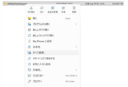 1.インストールは、ダウンロードした「nkMapViewSetup.zip」ファイルを選択し、右クリックのリストから「すべて展開」を選びます。