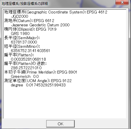 上記の投影情報の自動設定はprjファイルが必要、shpファイルとセットになります。イーネタネットのオンライン状態でprj2epsgによりprjの情報から投影情報を取得します。prjファイルない場合あるいはオフライン状態では投影情報を取得できません。また、投影情報を取得しでも、複数の投影情報を取得した場合では表示されません。ユーザー自分で投影情報の設定が必要です。「地理座標座系/投影座標系の設定」のボタンで投影設定選択フォームが表示します。「国/地域、地理座標系/投影系の選択」では「Japan」を選択し、日本の投影系座標系の設定可能の一覧が表示されます。その一覧の中に「4612 JGD2000」を選択します。「詳細フォーム」ボタンを押すと「地理座標系/投影系の詳細」フォームが表示し、地理座標座系/投影座標系の詳細設定が確認できます。そのフォーム「OK」ボタンで閉じます。また、選択確定しましたら、「OK」ボタンをクリックします。