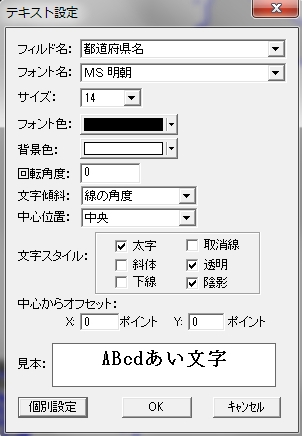 2.次にマップ画面に県名テキストレイヤー追加します。マップ左側レイヤーリストのJapanKenレイヤーを選択し、右ボタンで「新規テキストレイヤー追加」をクリックし、C:\nkMapData\JapanMap\JapanKen.shpを選択し、「テキスト設定」フォームが表示します。フィルド:都道府県、フォント名:MS明朝、サイズ:14、文字スタイル欄には太字と透明と陰影をチェックし、OKボタンで確定します。なお、文字スタイルを変更する場合、変更するテキストレイヤーを選択し、右ボタンで「レイヤースタイル変更」で再設定することが可能です。