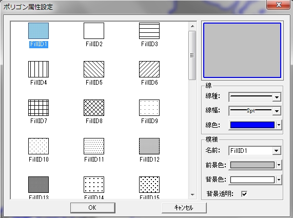 3.今度ポリゴンレイヤーのスタイルを変更します。レイヤーリストのポリゴンレイヤーJapanKenを選択し、右ボタンで「レイヤースタイル変更」をクリックし、ポリゴン属性設定のフォームが表示します。初期追加ポリゴンはFillID2の透明で表示されます。そこで線幅2ポイント、線色を青色に変更します。また、模様ではFillD1の完全非透明、前景色の灰色に変更します。