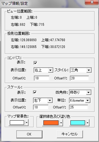 4.マップのコンパスとスケールを表示します。マップが表示された画面で、マウス右ボタン画面の任意部分をクリック、「マップスタイル変更」し、「マップ情報/設定」フォームを表示します。コンパス欄で表示チェックします。表示位置は右上と確認します。「スケール」欄で「表示位置」を右下、「単位」をKilometerをそれぞれ選択し、「OK」ボタンをクリックします。マップにはコンパスとスケール表示されます。