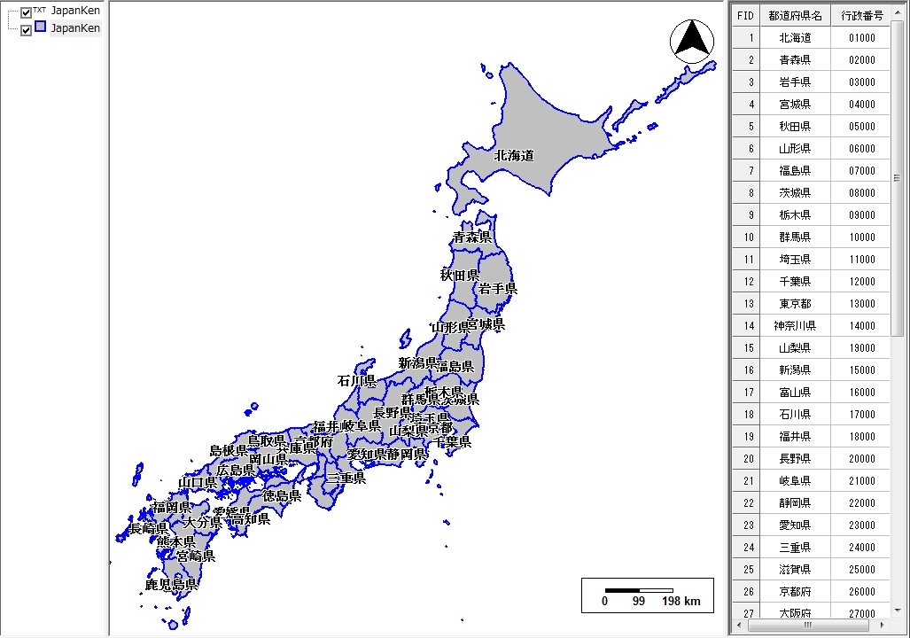 5.今度レイヤーの属性を確認します。ポリゴンレイヤーJapanKen或いはテキストレイヤーのJapanKenを選択し、右ボタンで「属性表データ表示」を選択します。マップの右側には属性表が表示されます。隠れた場合では、マップ右側やや左寄り縦線を掴んで左へ移動させば表示できます。