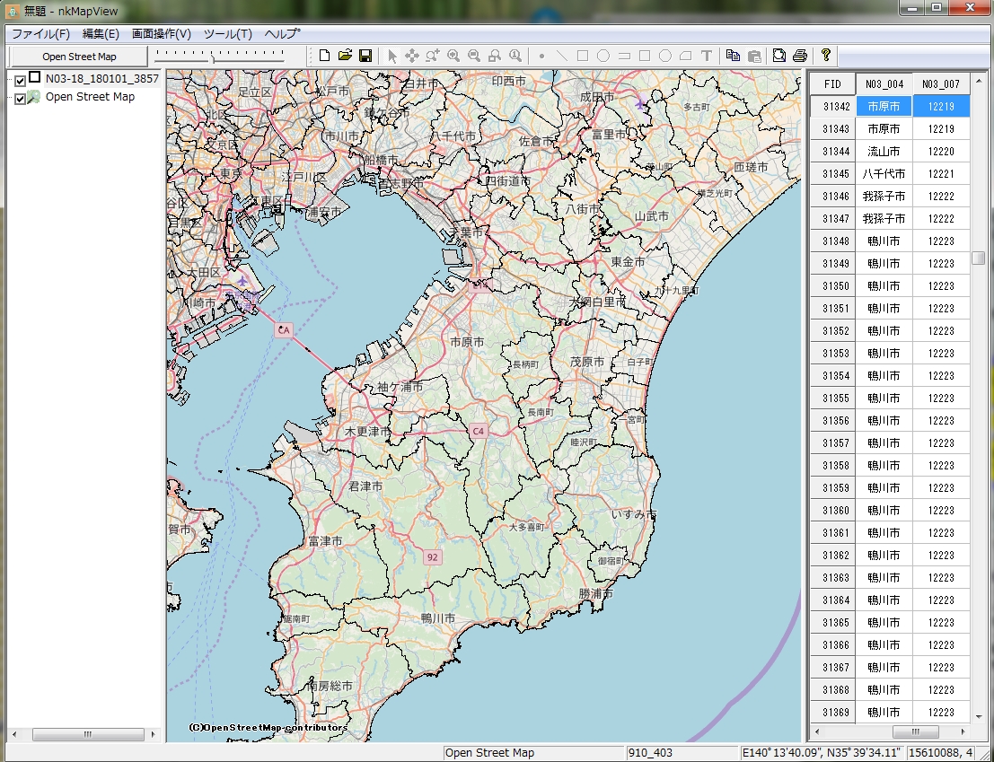 上記のデータは緯度経度投影のために、nkMapViewの「定義済みレイヤー」の緯度経度投影のマップで直接に追加できます。また、「地理院地図」、「Open Street Map」のインタネット地図にはダウンロードファイルを投影変換し、表示することが可能です。nkMapViewの「ツール」-「Shape/TIF投影変換」で変換します。詳細な変換方法はShape/TIF投影変換を参照ください。