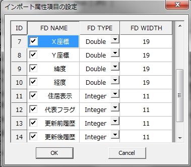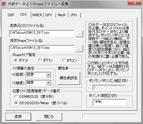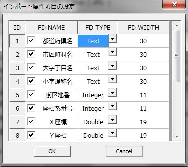 「ツール」-「Shapeファイルへ変換」で「CSV」フォームを選択します。「変換CSVファイル名」及び「保存Shapeファイル名」を入力し、Shapeタイプを「ポイント」、XY順番の経度緯度の項目を選択し、位置データ書式をDD.DDDDDD/Meter(d)の単位を決定します。「属性表設定」ボタンをクリックし、属性変換の項目名「FD NAME」の漢字数を5文字以内にします。「FD TYPE」と「FD WIDTH」を次の画面のように設定します。