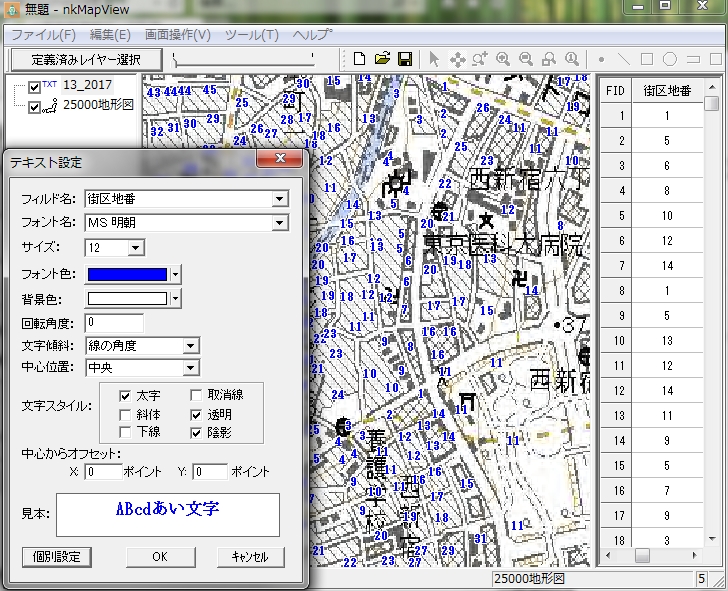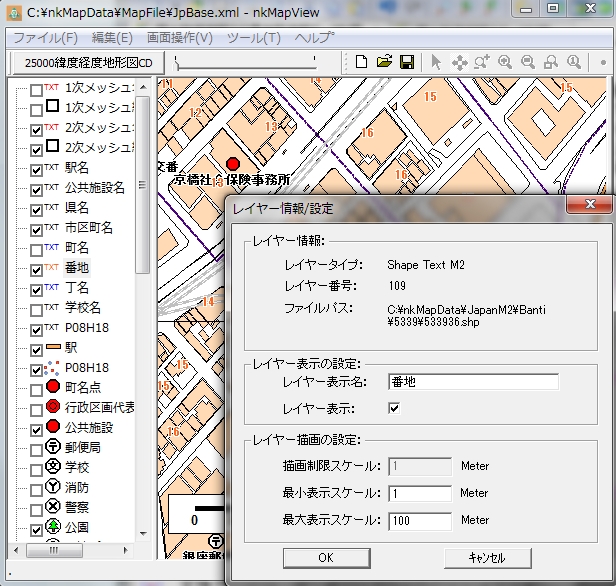 2次メッシュで分割したShapeファイルの連続表示、「番地」レイヤー