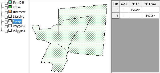 結合Merge:AとBは一つのCファイルに結合します。AとBのポリゴンをCにコピーします。属性について、共通の項目がある場合、AとBのレコードをCに作成し、共通の項目がない場合、AとBの項目を新たにCに作成します。