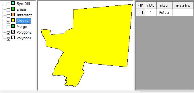 融合Union:Aの交差している二つのポリゴンを一つに融合し、Cのファイルを作成します。AとBファイルでは共通のフィルド名が融合の条件です。属性項目は融合の1番レコードしか保存されません。