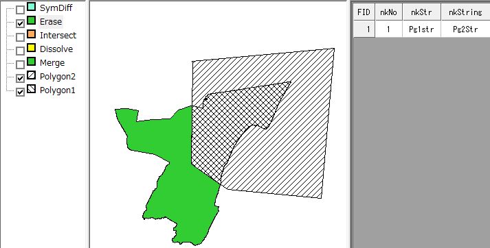 切り取りErase:AとBが交差しているポリゴンの場合、AをBで切り取ります。属性について、共通の項目がある場合、AのレコードをCに作成し、共通の項目がない場合、Aの項目を新たにCに作成します。