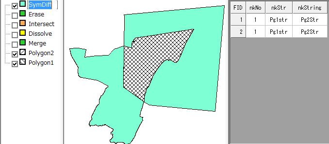非交差SymDifference:AとBが交差しているポリゴンの場合、AとBの共通の部分を切り取ります。属性について、共通の項目がある場合、AとBのレコードをCに作成し、共通の項目がない場合、AとBの項目を新たにCに作成します。