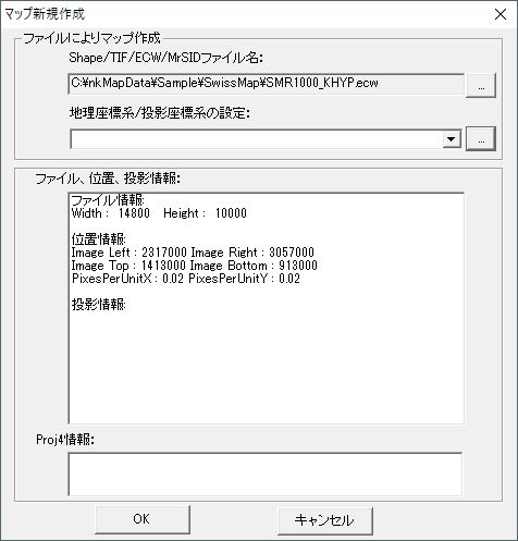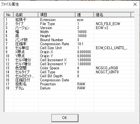 位置情報を正しく読み込むために、SMR1000_KHYP.tfwはSMR1000_KHYP.ecwと同じフォルターに置く必要です。 本ソフト表示リストの「SMR1000_KHYP」を選び、マウス右ボタンを押して「ファイル属性表示」でecwファイル情報を表示します。中央マップを選択し、マウス右ボタンを押して「マップ投影情報表示」での投影系を確認できます。