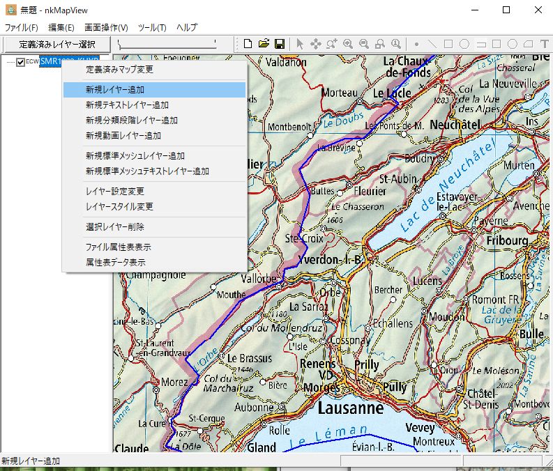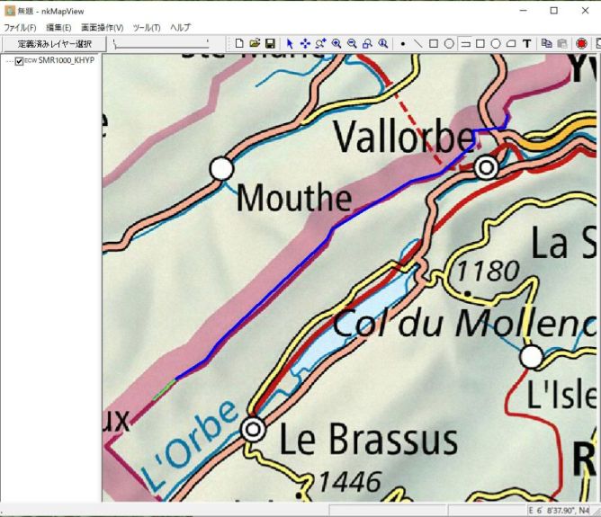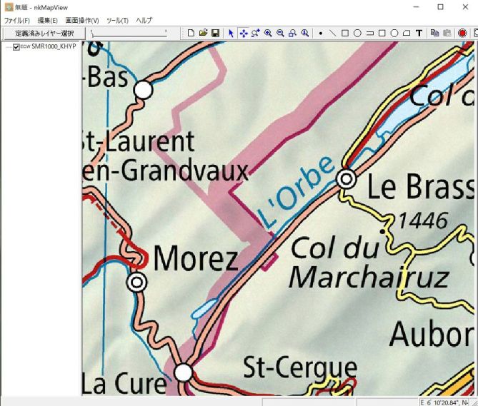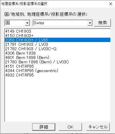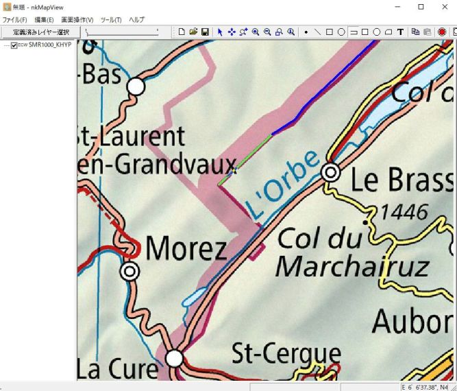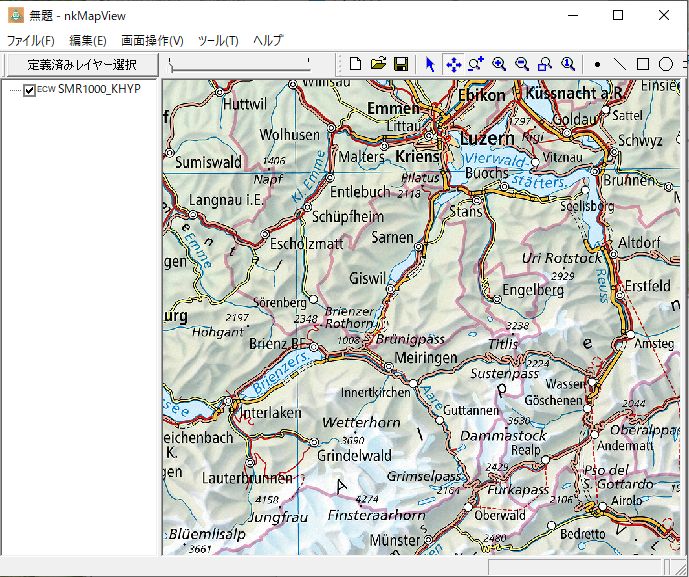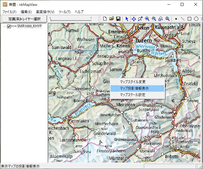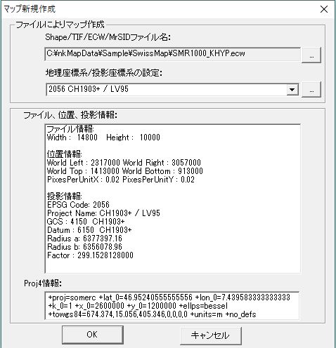 本ソフトでマップ新規作成します。地理座標系投影系は「SwissのCH1903+/LV95」を選択し、SMR1000_KHYP.ecwを選び、マップ表示します。