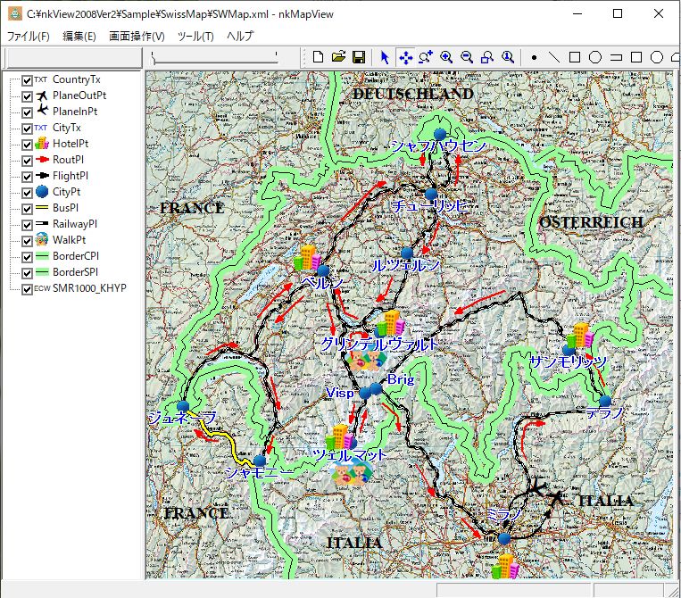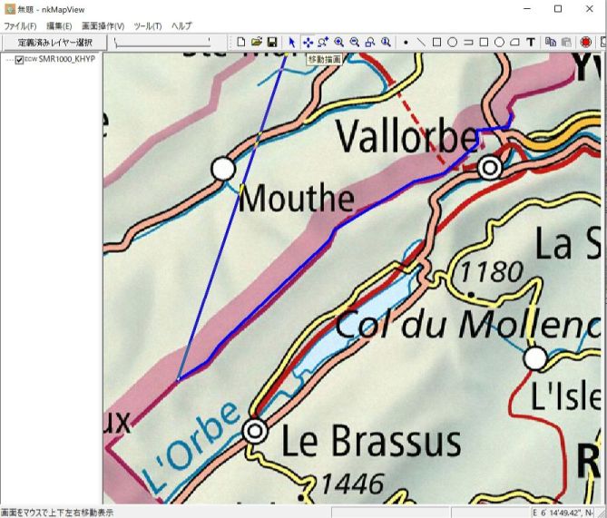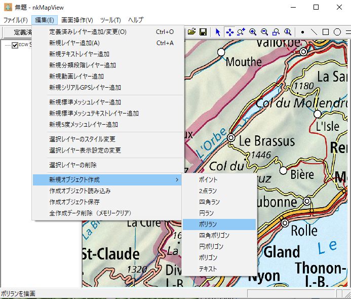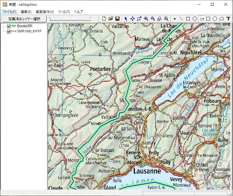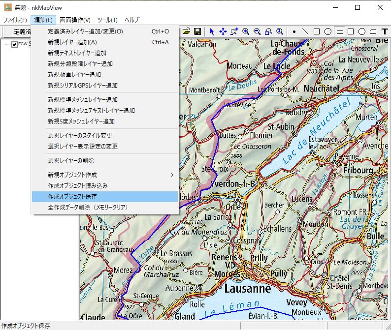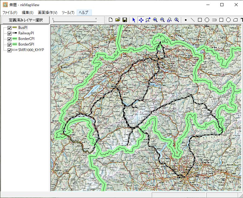 ツールバーの「ポリランを描画」ボタンを押し、スイス国境線をなぞります。作業途中に移動ボタン、拡大縮小ボタンを押しながら線の描画作業をすることが可能です。ダブルクリックで描画が終了します。「編集」-「作成オブジェクト保存」によりSHPの形式で保存します。描画作業が終了時に「編集」-「全作成データ削除」でメモリーをクリアーできます。