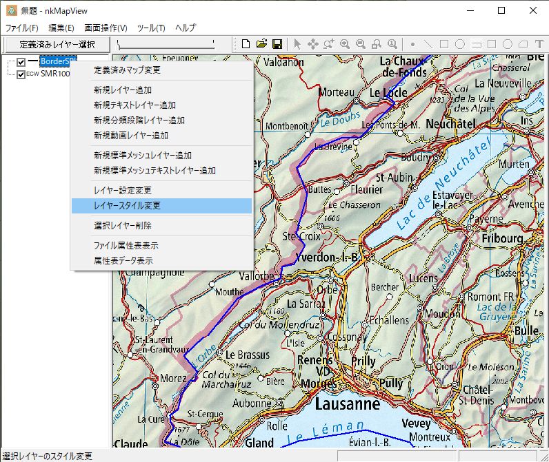 なお、線の描画作業について線幅及び線色は右ボタン「マップスタイル」設定で変更できます。作成したスイス国境線SHPファイルをマップへ読み込み、国境線スタイルで表示します。