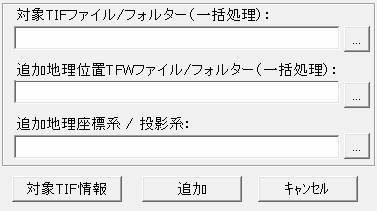 「ツール」−「TIFからGeoTIF」ツールにより起動し、対象TIFファイル及びTFWファイルを選択し、地理座標系/投影系を選び、「追加」ボタンでGeoTIFファイルを作成できます。
