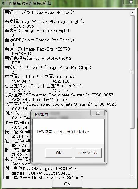 GeoTIFファイルの位置情報/投影情報の確認も可能です。対象のGeoTIFファイルを選択し、「対象TIF情報」をクリックし、GeoTIFの投影情報及び位置情報を表示します。TFW位置情報を保存する場合、GeoTIFファイルの同じ場所にTFWファイルを作成されます。対象のGeoTIFフォルターに一括出力ことも可能です。