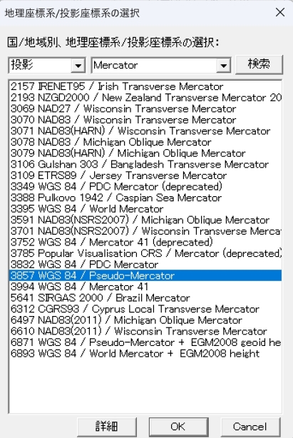 「変換先地理座標系/投影系」欄の右ボタンをクリックし、「地理座標系/投影座標系の選択」から「投影」を選択し、投影一覧から「Mercator」を選択します。Mercator投影リストから「3857 WGS84/Pseudo-Mercator」を選びます。