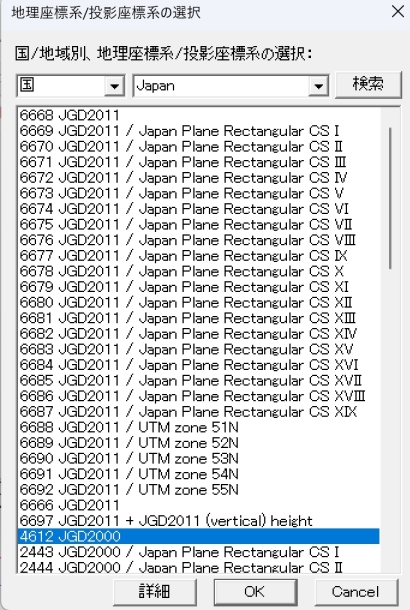 「変換元地理座標系/投影系」欄に右ボタンをクリックし、「地理座標系/投影座標系の選択」から「4612 JGD2000」を選択し、「OK」ボタンをクリックします。