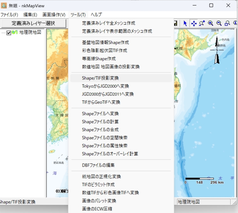 メユーバーの「ツール」-「Shape/TIF投影変換」をクリックし、変換ツールを起動します。
