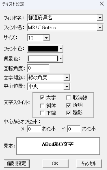 マウスの左ボタンでマップ左側のレイヤーリストから「JapanKen」を選択し、マウスの右ボタンでクリックし、メニューリストから「新規テキストレイヤー追加」を選択します。C:\nkMapData\JapanMap3857から「JapanKen」を選択し、「開く」オタンをクリックし、ダイアログボックス「テキスト設定」を表示しします。「フィルド名」を都道府県名に指定、「サイズ」16を指定、「太字」チェック、「透明」チェック、「陰影」チェックし、マップ画面にJapanKen属性の「都道府県」文字データーが表示されます。